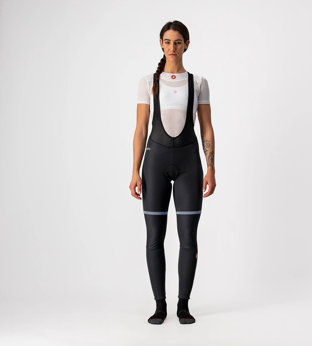 De Polare 3 Bibtight is de warmste broek die Castelli op dit moment maakt. De broek is gemaakt van GORE-TEX INFINIUM WINDSTOPPER X-Fast stof aan de voorkant, waardoor de voorkant van de broek volledig winddicht is. Hierdoor worden je benen goed beschermd tegen de kou van de wind. De achterkant van de broek is op de onderkant van de pijpen bewerkt met de Nano Flex 3G stof, welke beschermt tegen opspattend water. Dankzij de KISS Air2 Donna zeem zit je comfortabel in het zadel, zelfs tijdens langere ritten. De mesh bretels zijn zeer ademend, waardoor ze comfortabel zitten en geen vocht vasthouden. Dankzij de reflecterende details boven en onder de knie ben je ook in het donker nog goed zichtbaar voor het overige verkeer.